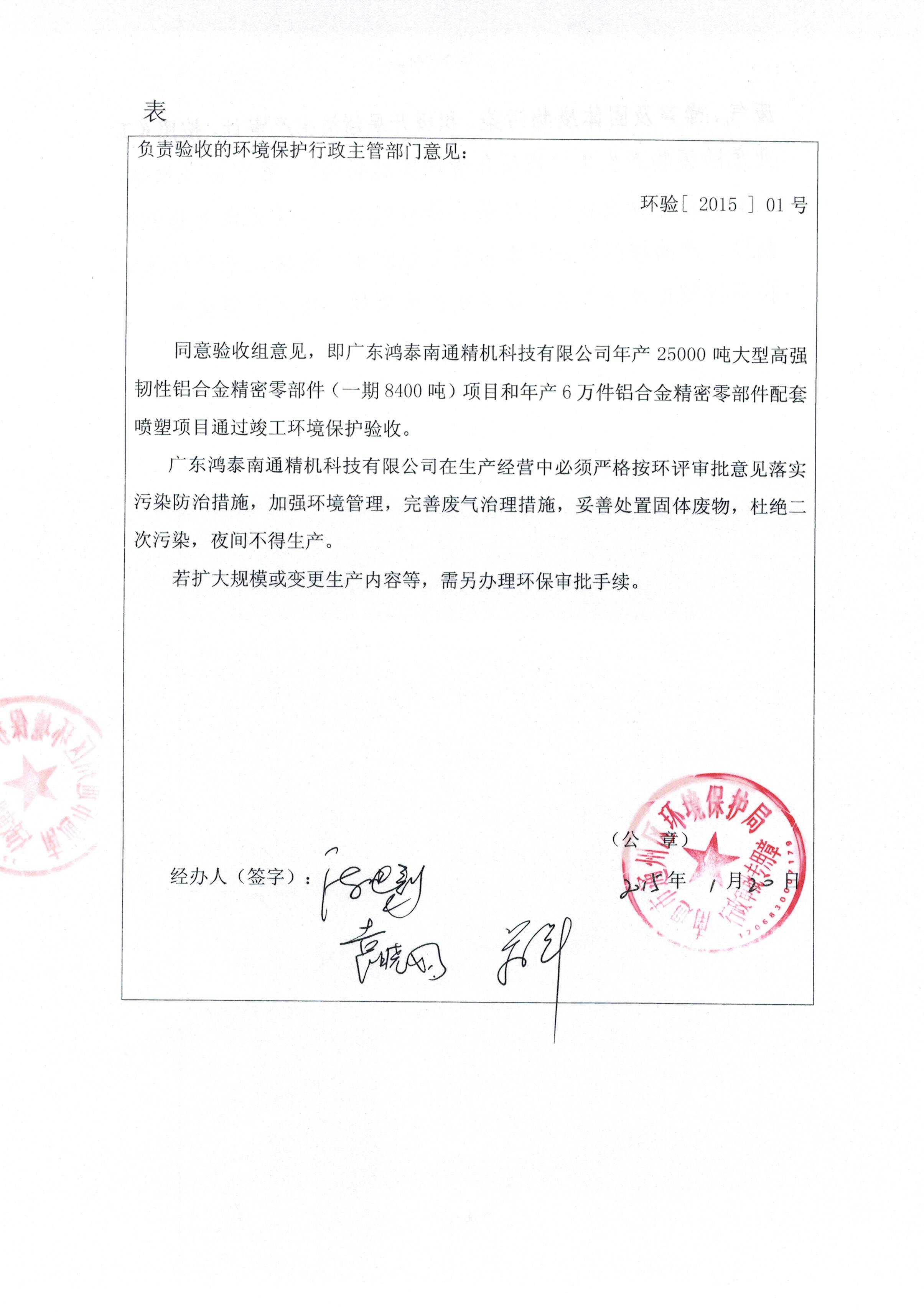 2015年1月20日通州區環(huán)保局同意驗收組意見(jiàn),廣東鴻泰一期項目(年產(chǎn)8400噸大型高強韌性鋁合金精密零部件和年產(chǎn)6萬(wàn)件鋁合金精密零部件配套噴塑項目)通過(guò)竣工環(huán)境保護驗收,我公司將按照規定合法合規操作,加強環(huán)境保護。